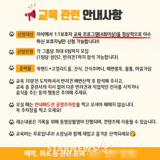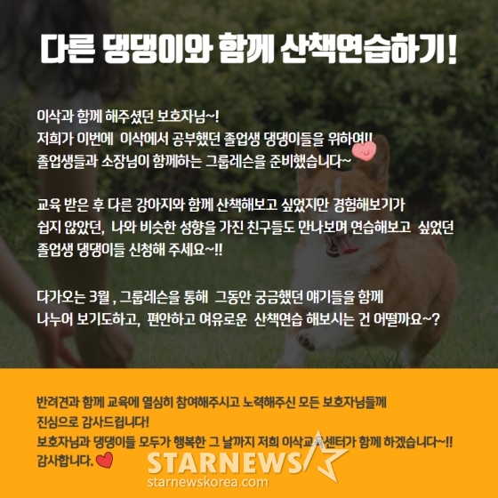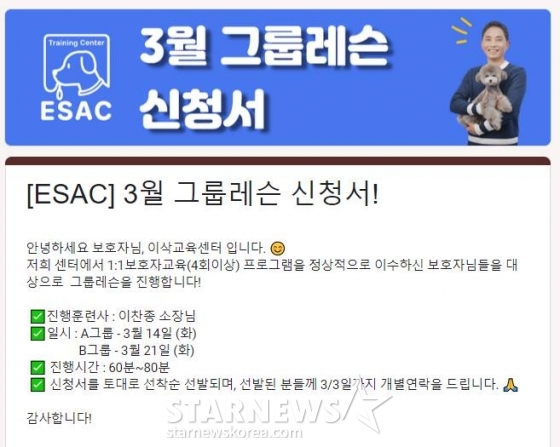 클래스는 3월 14일 오후 1시 진행하는 A그룹과 3월 21일 오후 1시 진행하는 B그룹 두 가지가 있으며, 각 클래스 당 60~80분간 수업을 진행한다고 설명돼 있었다. 훈련소 측은 "소장님과 함께 재밌고 즐거운 산책되세요"라고도 공지했다.
