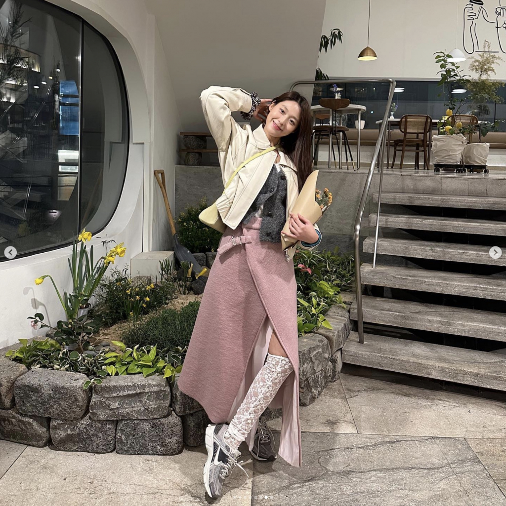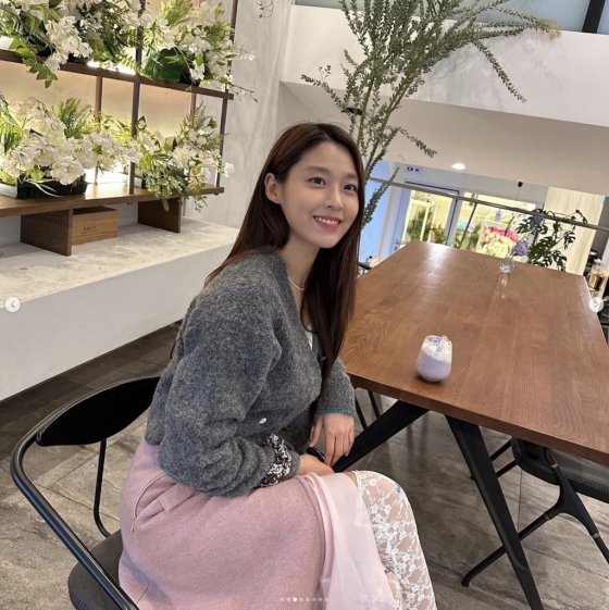 공개된 사진 속 설현은 회색 카디건에 분홍색 치마를 입고 흰색 레이스 스타킹을 신은 모습. 설현은 변함없는 미모를 자랑하며 미소 짓고 있어 눈길을 끈다.