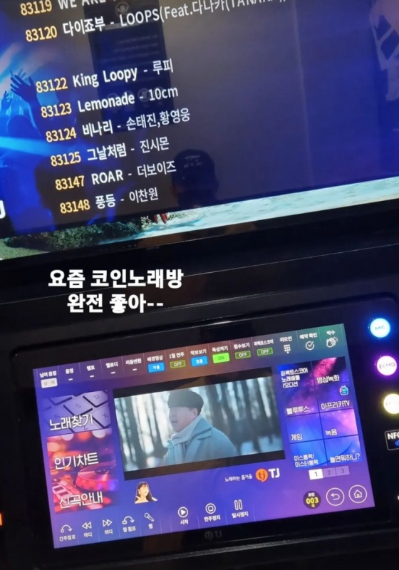 한정민은 "노래방 내 TV 화면에 비쳐진 노래 목록들을 사진으로 찍고 "요즘 코인노래방 완전 좋아~~"라고 밝혔다.