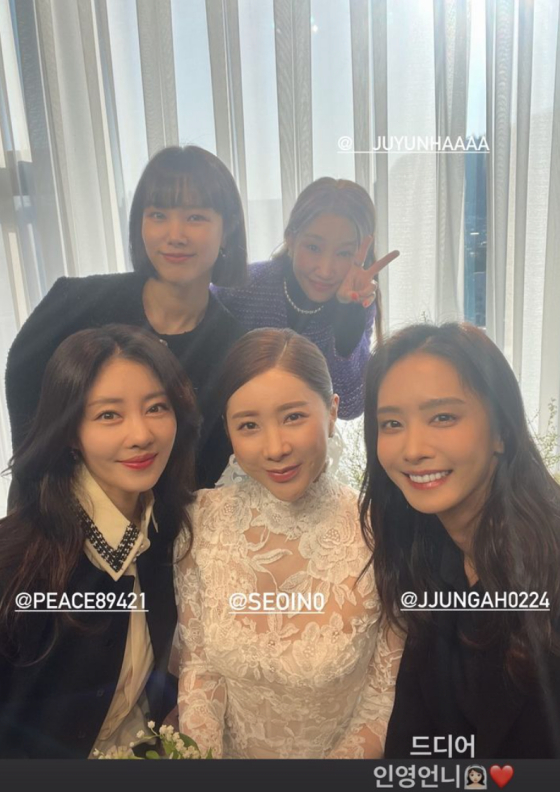 공개된 사진에는 웨딩드레스를 입은 서인영을 둘러싼 김은정, 박정아, 이지현, 하주연 등 그룹 쥬얼리 멤버들의 모습이 담겨 있다. 이들은 변함 없는 미모와 돈독한 애정을 드러내 훈훈함을 자아냈다.