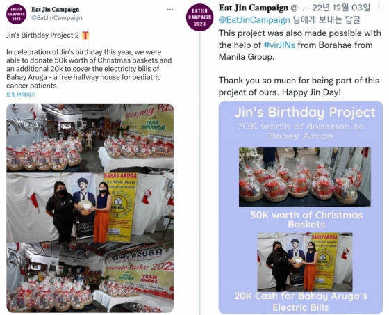 '잇진 캠페인'은 또 진의 생일(2022년 12월 4일)을 기념하며 '생일 프로젝트2'를 진행, 뜻깊은 기부에 참여했다. 5만 원 상당의 크리스마스 바구니와 소아암 환자를 위한 거주시설 '바헤이 아루가'(BAHAY ARUGA)의 전기 요금을 충당하기 위해 추가로 2만 달러를 기부했다. 이 프로젝트는 마닐라 보라해의 #virJINS 덕분에 가능했다며 "이 프로젝트에 참여해 주셔서 대단히 감사합니다. 행복한 진데이!"라고 전했다.