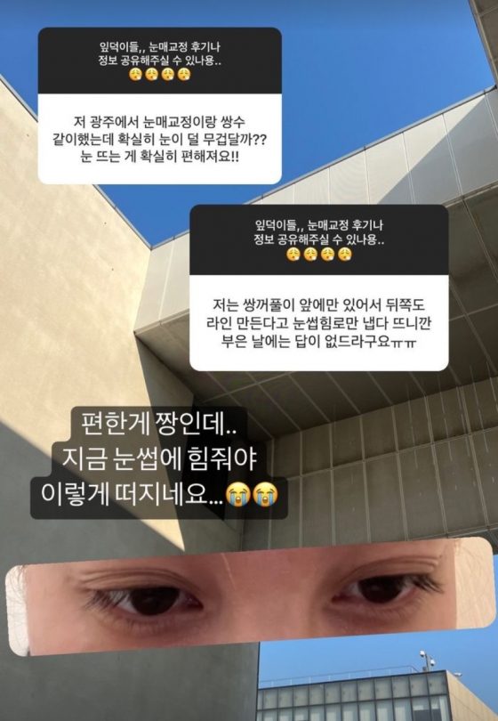 먼저 유깻잎은 눈매 교정 후기와 관련한 글들을 보고 "편한게 짱인데 지금 눈썹에 힘줘야 이렇게 떠지네요"라며 자신의 눈 모습을 사진으로 공개했다.