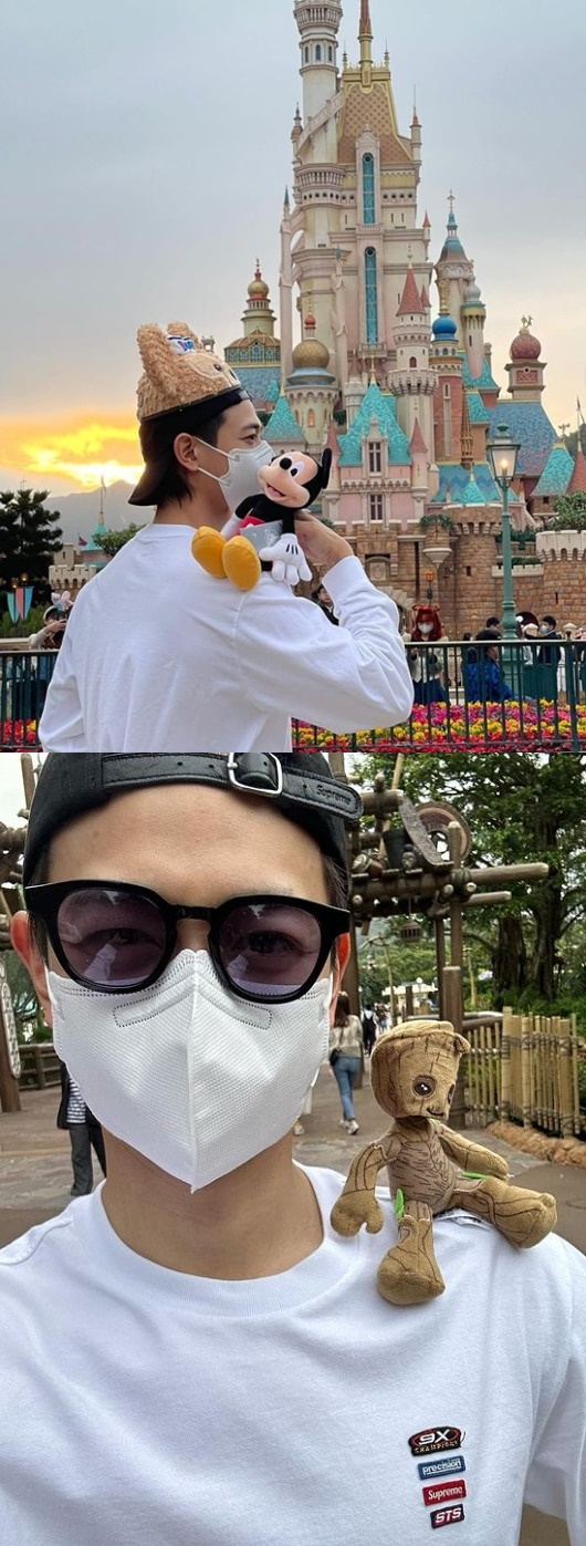 공개된 사진에는 흰 티를 입은 최민호가 캐릭터 모자를 쓴 채 디즈니랜드 성 앞에서 포즈를 취하는 모습이 담겼다. 또 다른 사진 속 그는 모자를 뒤집어쓰고 인형을 어깨에 앉힌 채 셀카를 찍으며 즐거움을 만끽했다.