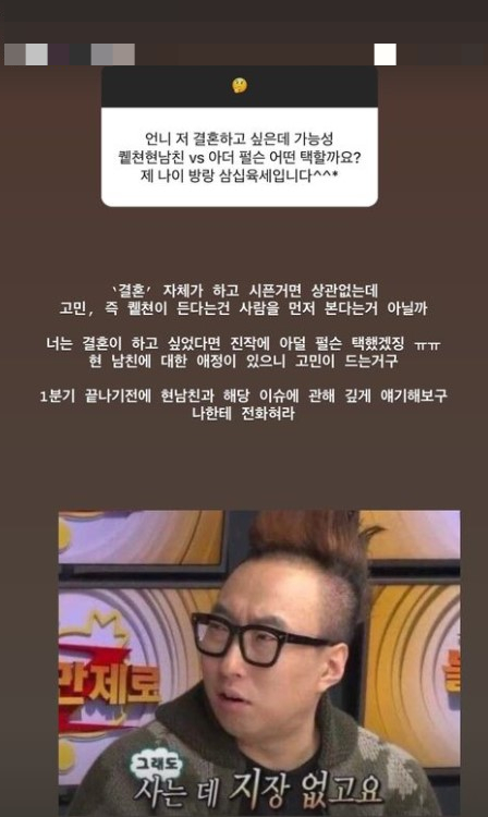 고초희는 이어 결혼에 대한 고민을 털어놓은 팬에게는 "결혼 자체가 하고 싶은거면 상관없는데 고민이 든다는 건 사람을 먼저 본다는 거 아닐까"라며 "결혼이 하고 싶었다면 진작에 아덜 펄슨을 택했겠지. 현 남친에 대한 애정이 있으니 고민이 드는거고. 1분기 끝나기 전에 현 남친과 해당 이슈에 관해 깊게 얘기해봐"라고 조언했다.