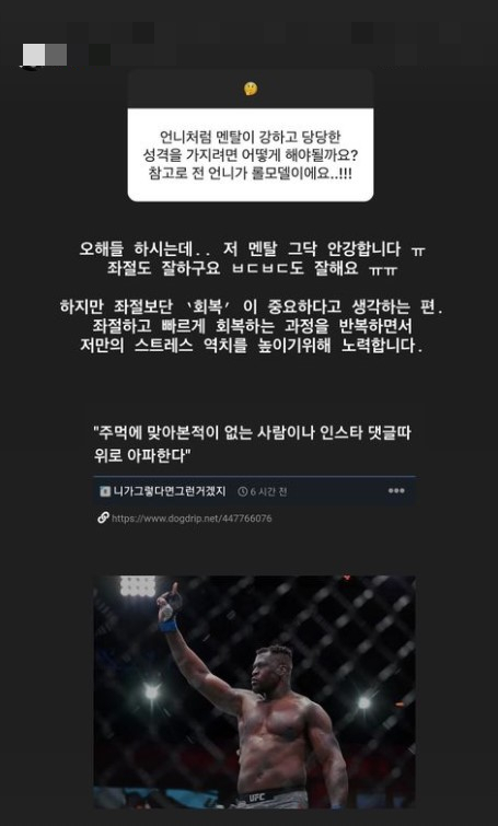 또한 고초희는 "오해들 하시는데 저 멘탈 그닥 안 강합니다. 좌절도 잘하고 부들부들도 잘해요"라고 답하고 "하지만 좌절보다 회복이 중요하다고 생각하는 편. 좌절하고 빠르게 회복하는 과정을 반복하면서 저만의 스트레스 역치를 높이기 위해 노력합니다"라고 밝혔다.