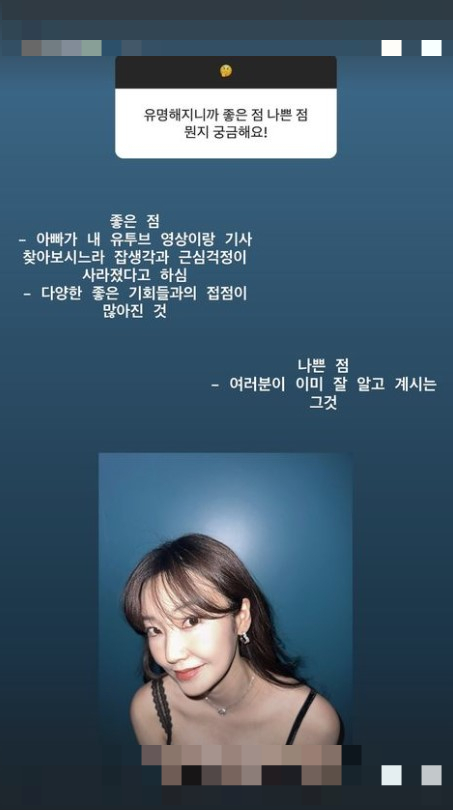 이어 "유명해지니까 좋은 점은 아빠가 내 유튜브 영상이랑 기사 찾아보시느라 잡생각과 근심걱정이 사라졌다고 하심. 다양한 좋은 기회들과의 접점이 많아진 것"이라며 "나쁜 점은 여러분이 이미 잘 알고 계시는 그것"이라고 덧붙였다.