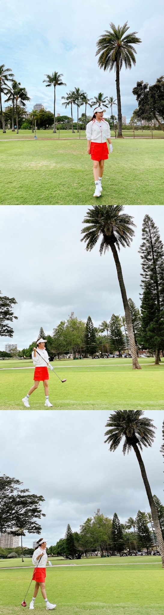 공개된 사진에는 하와이에서 골프를 즐긴 송가인의 모습이 담겼다. 송가인은 레드 컬러의 스커트를 착용, '골프 여신' 자태를 뽐냈다.