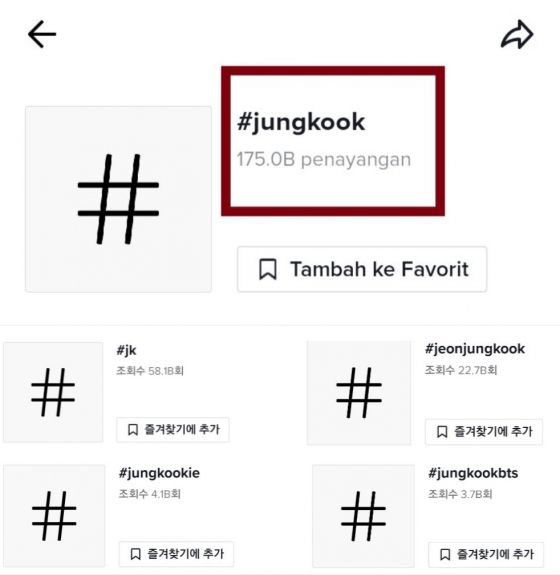 틱톡에서 '#JK'는 581억뷰, '#jeonjungkook'은 227억뷰, '#jungkookie'는 41억뷰, '#jungkookbts'은 37억뷰 등 정국과 관련된 또 다른 해시 태그들도 막대한 조회수를 자랑했다.