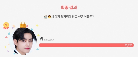방탄소년단 (BTS) 뷔가 '새 학기 옆자리에 앉고 싶은 남자 아이돌' 1위에 오르며 인기를 빛냈다.