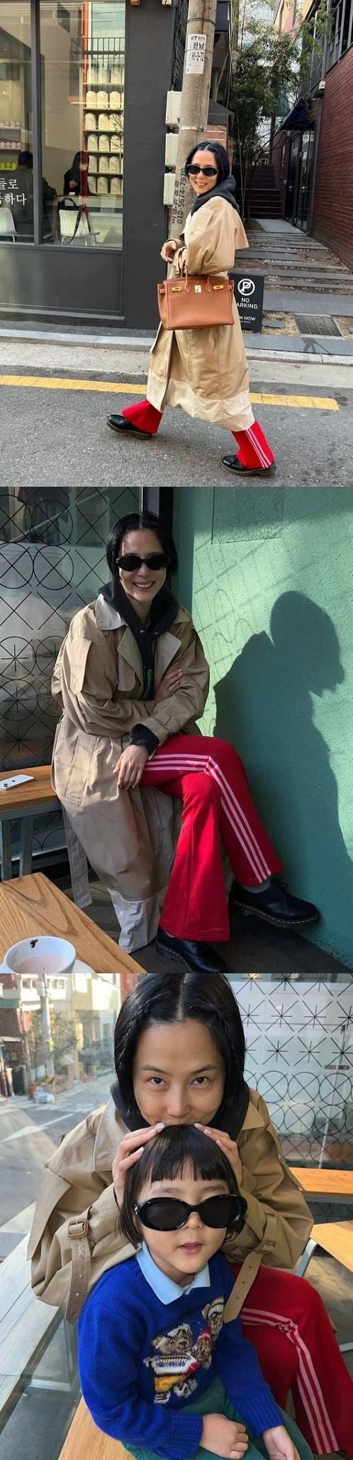 사진 속 김나영은 트렌치코트에 빨간색 트레이닝복을 매치해 자연스러우면서도 힙한 패션을 보여주고 있다.
