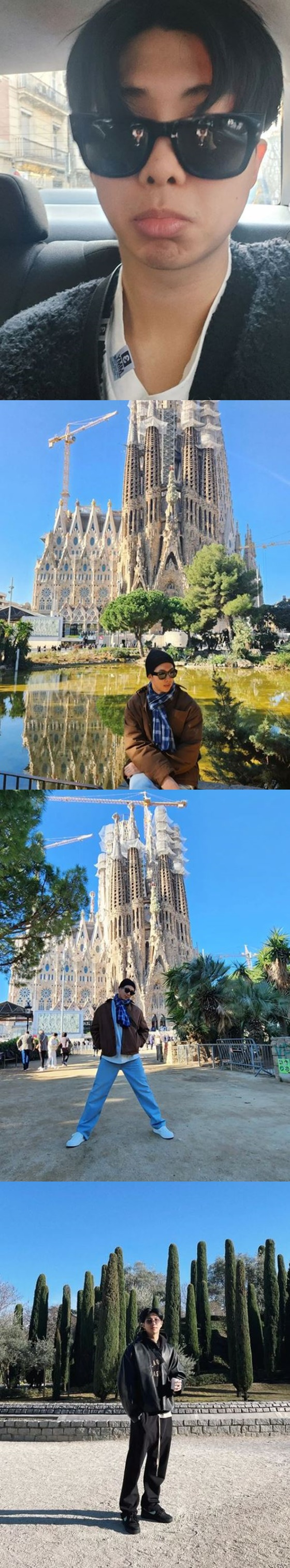그가 공개한 사진에는 가족과 떠난 것으로 보이는 스페인 여행에서 다양한 분위기를 자랑하는 RM의 모습이 담겼다.
