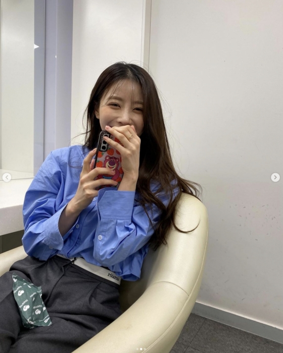 공개된 사진 속 이미주는 하늘색 셔츠에 회색 바지를 입고 휴대폰으로 입을 가리며 눈웃음을 보였다. 이미주는 매력 넘치는 미소로 시선을 모았다.