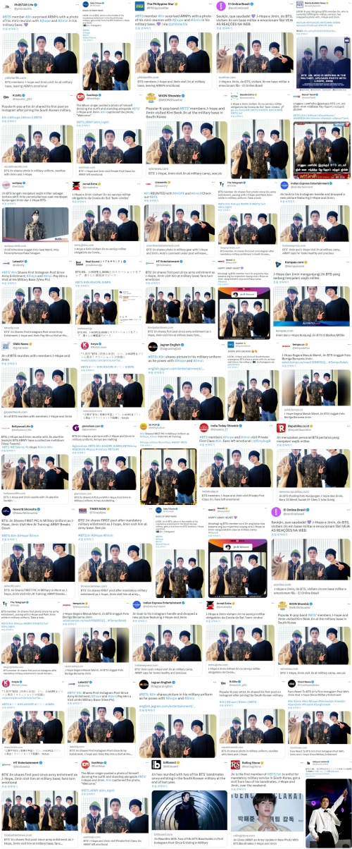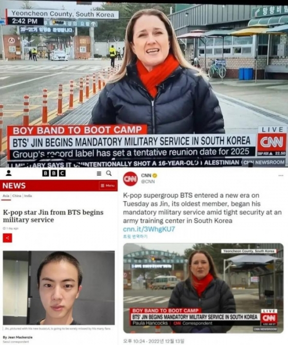 'GMA News', 'Inquirer', 'TIMES NOW', 'Clout News' 등 수많은 외신들은 공식 트위터 계정을 통해 진의 소식을 전했다. 진의 사진과 함께 입대 날짜, 군복을 입고 올린 셀카 사진, 조교로 발탁된 사실, 제대 예정 날짜 등의 진 관련 다양한 소식을 전하며 주목을 모았다.