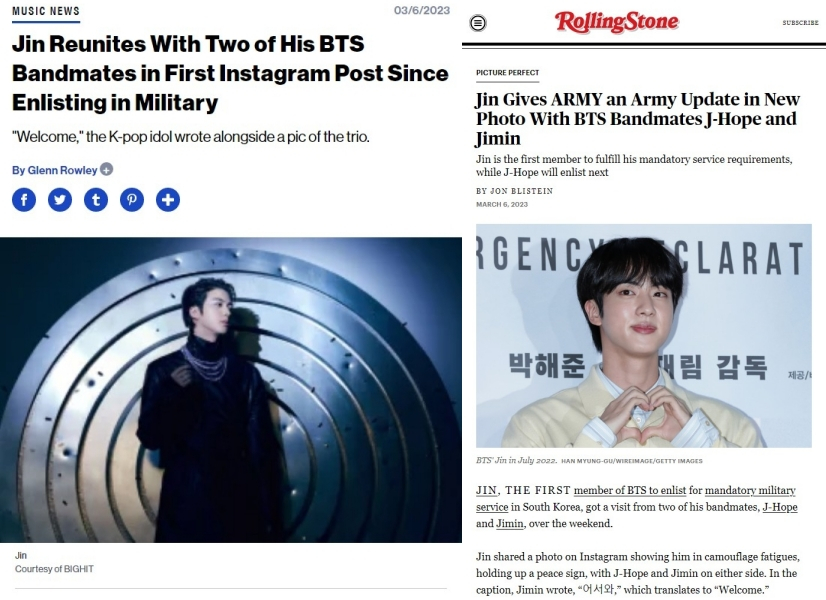 진이 사진이 공개된 후 빌보드, 롤링스톤 등 주요 외신들도 소식을 전했다. 빌보드는 공식 트위터 계정 및 홈페이지를 통해 진의 사진과 함께 '진, 입대 후 첫 인스타그램 게시물에 멤버 두 명과 제회'라는 기사를 게재했다.