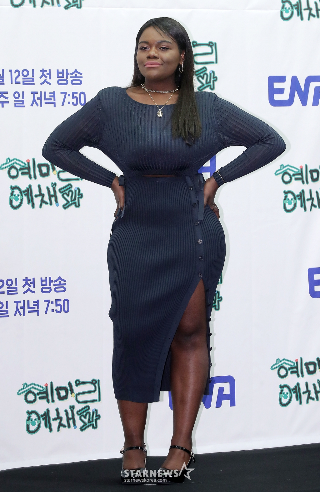 방송인 파트리샤가 9일 오전 서울 마포구 상암동 스탠포드 서울에서 진행된 ENA 예능 '혜미리예채파' 제작발표회에 참석해 포즈를 취하고 있다.