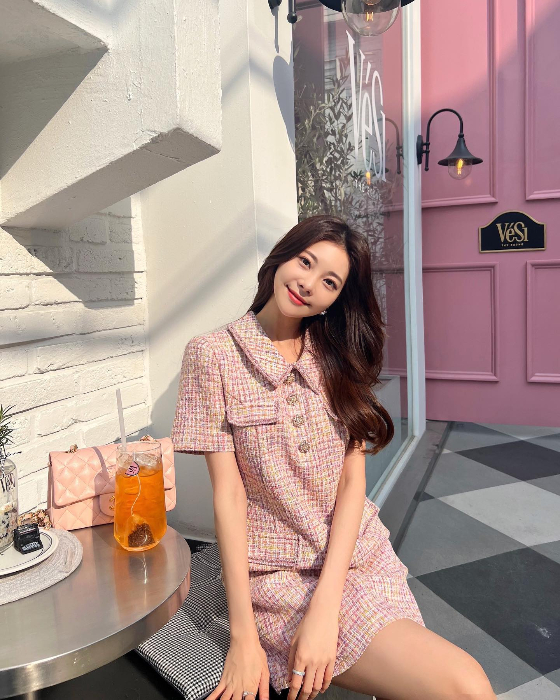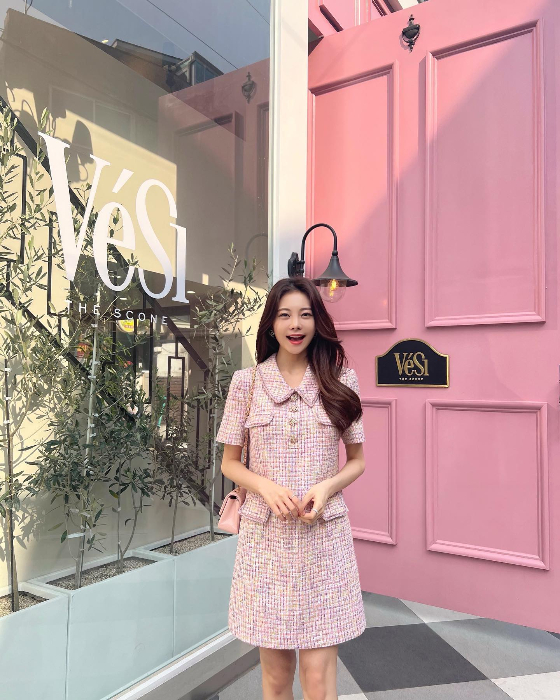 공개된 사진에는 핑크빛에 체크무니가 있는 의상을 입은 아옳이가 한 카페를 방문한 모습이 담겼다. 아옳이는 핑크빛 문을 배경으로 '핑크색'에 흠뻑 빠진 모습을 보여줬다. 또한 우아하면서도 새침한 매력까지 더해 팬들의 시선을 사로잡았다.