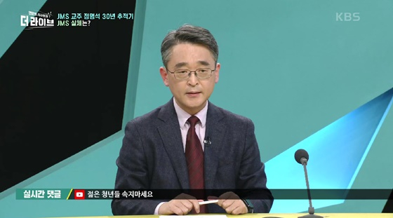 전날 김도형 교수는 시사교양프로그램 '더 라이브'에 출연해 "정명석을 비호하는 사람이 먼 데 있지 않다. 이 KBS에도 있다"고 주장했다.