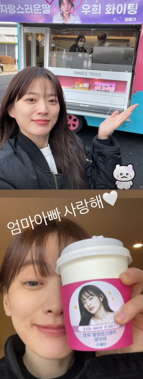 공개된 사진에는 검은색 패딩을 입은 천우희가 커피차 앞에서 미소를 띤 모습이 담겼다. 커피차에는 '자랑스러운 딸 우희 파이팅. 엄빠(엄마, 아빠)가'라는 문구가 새겨졌다. 천우희는 단란한 가족 사이를 인증해 부러움을 자아냈다.