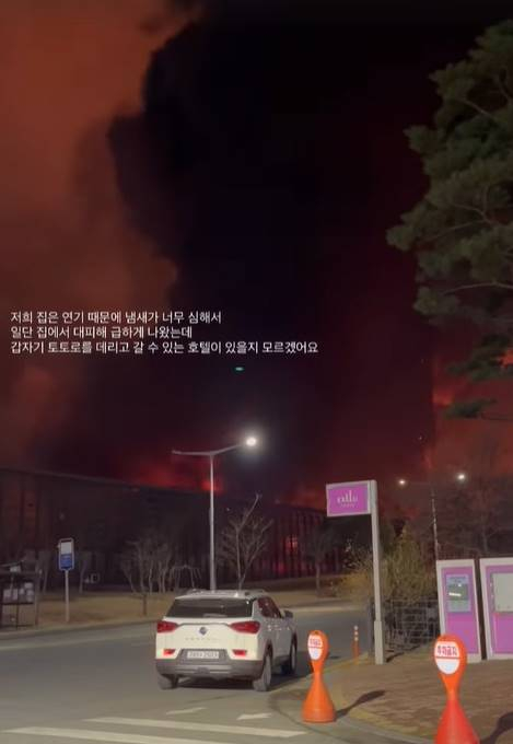 또한 "다른 아파트 주민 가족분들도 서서히 많이 오시네요. 연기가 여기까지 보이는데 집에 있는 게 도저히 어려울 듯싶은데 아파트 정문 나오면서 나오길 잘했다 싶었어요. 유민이가 사정 부탁드리는 동안 호텔 밖에서도 연기가 보여요"라며 "연기랑 냄새가 오히려 더 심해져서 눈이 다 따갑네요. 유민이가 내일 일찍 일정이 있는데 저희는 급한 대로 차에서 자야 할까 봐요"라고 속상함을 드러냈다.
