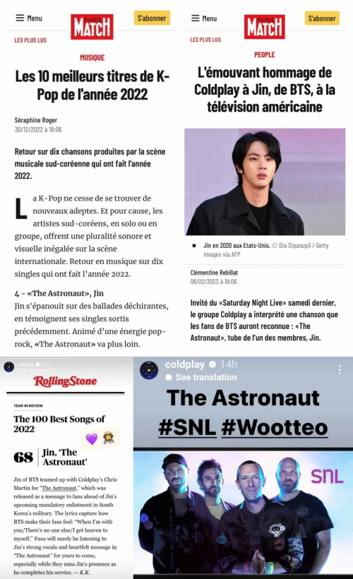 해당 매체는 지난 2월 7일 콜드플레이가 미국 TV쇼 SNL에서 진의 '디 애스트로넛'의 영어 버전을 부른 것을 조명하기도 했다. 콜드플레이는 진이 앨범 프로모션의 일환으로 만든 캐릭터 '우떠(Wootteo)'가 붙은 티셔츠를 입고 나왔으며, 매체는 이를 놓치지 않았다.
