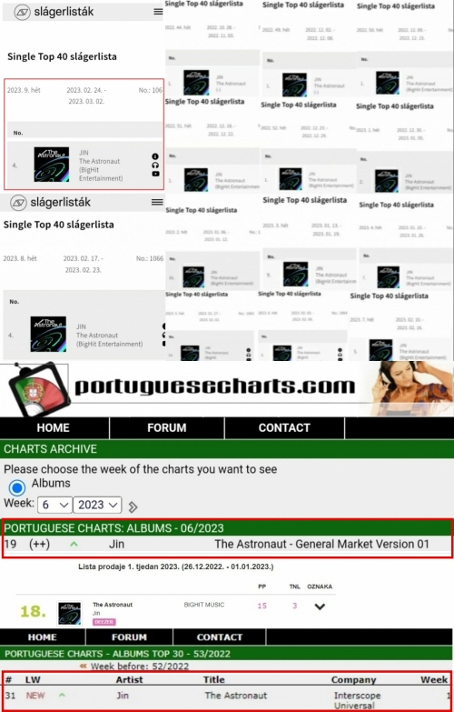 또 다른 유럽 도시, 헝가리와 크로아티아, 포루투칼에서도 진의 인기는 독보적이다. 진의 솔로곡 '디 애스트로넛'은 헝가리 2023년 9주차 헝가리 '싱글 톱 40 차트(Hungary's Single Top 40 Chart)'에서 아시아 솔로 최장 신기록인 14주 차트인을 기록하며 범접할 수 있는 인기를 입증하고 있다.