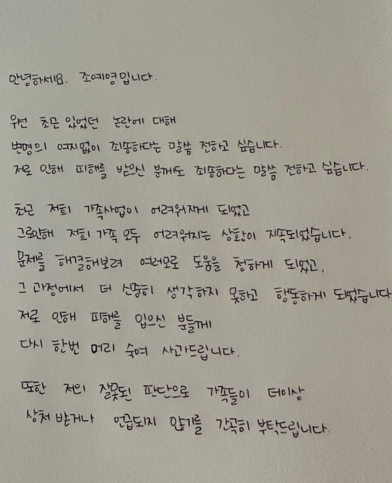 조예영은 11일 자필 사과문을 통해 자신의 논란에 대해 사과하며 "최근 있었던 논란에 대해 변명의 여지 없이 죄송하다. 저로 인해 피해를 받으신 분께도 죄송하다. 최근 저희 가족 사업이 어려워지게 됐고 그로 인해 가족 모두 어려워지는 상황이 지속됐다. 문제를 해결해보려 여러모로 도움을 청했고 그 과정에서 신중히 생각하지 못하고 행동하게 됐다. 저의 잘못된 판단으로 가족들이 더이상 상처받거나 언급되지 않기를 부탁드린다"라고 덧붙였다.