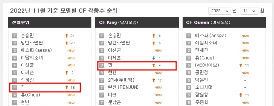 진은 한국광고총연합회 광고정보센터가 공개한 지난해 11월 CF모델 랭킹 결과, 공동 4위에 이름을 올렸다. 남자모델 순위에서는 공동 3위를 차지했다. 진라면 단 한 광고로 이룬 이례적인 결과다.