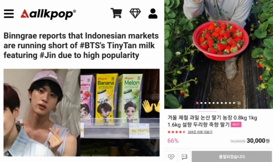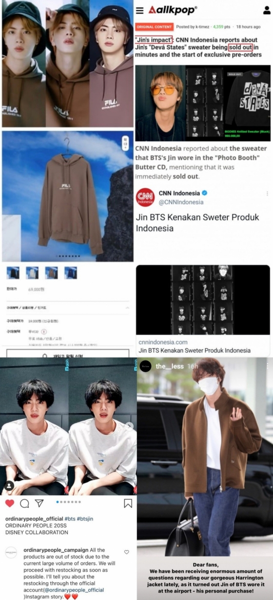 진이 착용한 옷의 브랜드들이 연이어 품절 공지를 냈으며, 진이 멤버와 지인들에게 선물한 두리향 딸기는 끝없는 품절과 함께 이제는 BTS 딸기로 명명되고 있을 정도다. 최근에는 빙그레가 인도네시아 현지에서 판매하는 방탄 타이니탄 캐릭터 포장재 우유 중 특히 진의 우유가 찾아보기 힘들 정도로 품귀 현상을 보인 것이 큰 화제가 됐다. 현지에서 잘생긴 남자(Mr. Handsome)라는 뜻의 '마스간떵(Mas Ganteng)'으로 불리며 수많은 팬을 몰고 다니는 진 캐릭터가 그려진 제품이 폭발적 인기를 보인 것이다.