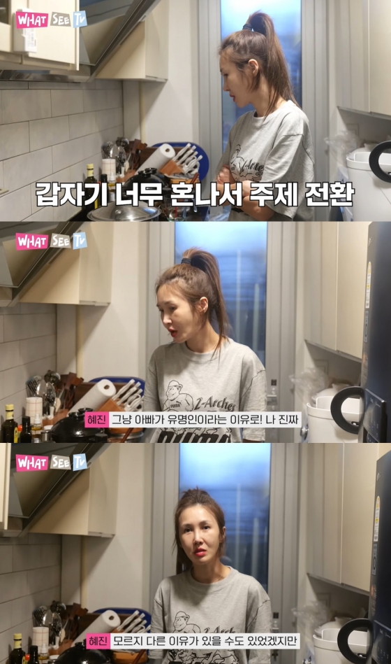 윤혜진은 딸의 학교생활을 말하다 "난 초등학교 3, 4, 5학년 때가 최악이었다. 그때 정말 따돌림을 받았다. 그냥 아빠가 유명인이라는 이유로. 모르지, 또 다른 이유가 있었겠지만 난 항상 학교에서 주눅이 들었다"라고 털어놨다.