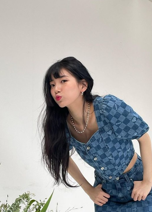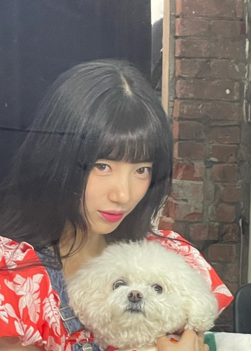공개된 사진에는 빨간색 꽃무늬 티셔츠와 청색 멜빵을 입은 수지가 강아지를 안고 카메라를 응시하는 모습이 담겼다. 또 다른 사진 속 수지는 파란색 투피스를 입고 포즈를 취하며 인형 미모를 인증했다.