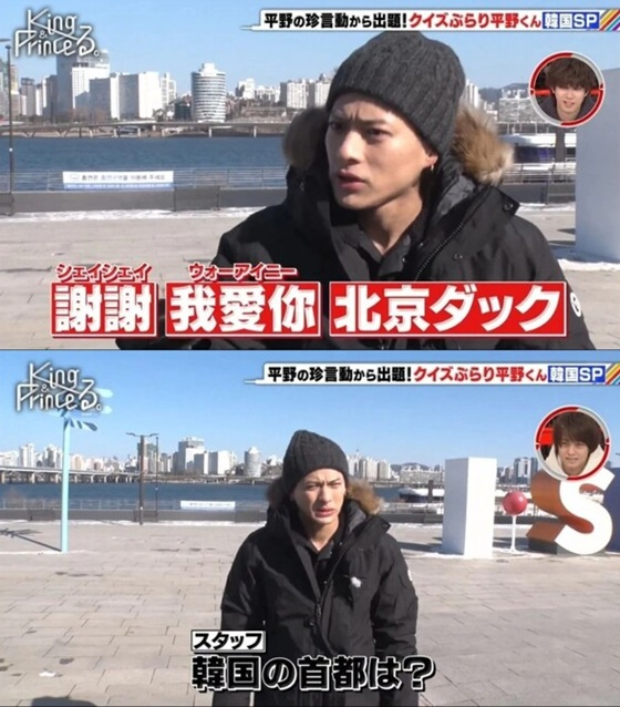 해당 영상에서 스태프가 알고 있는 한국어에 대해 질문하자 히라노 쇼는 "워 아이 니" "씨에씨에" "베이징 덕"이라고 답했다. 한국의 수도가 어디냐는 질문에는 "바쿠"라고 답했다.