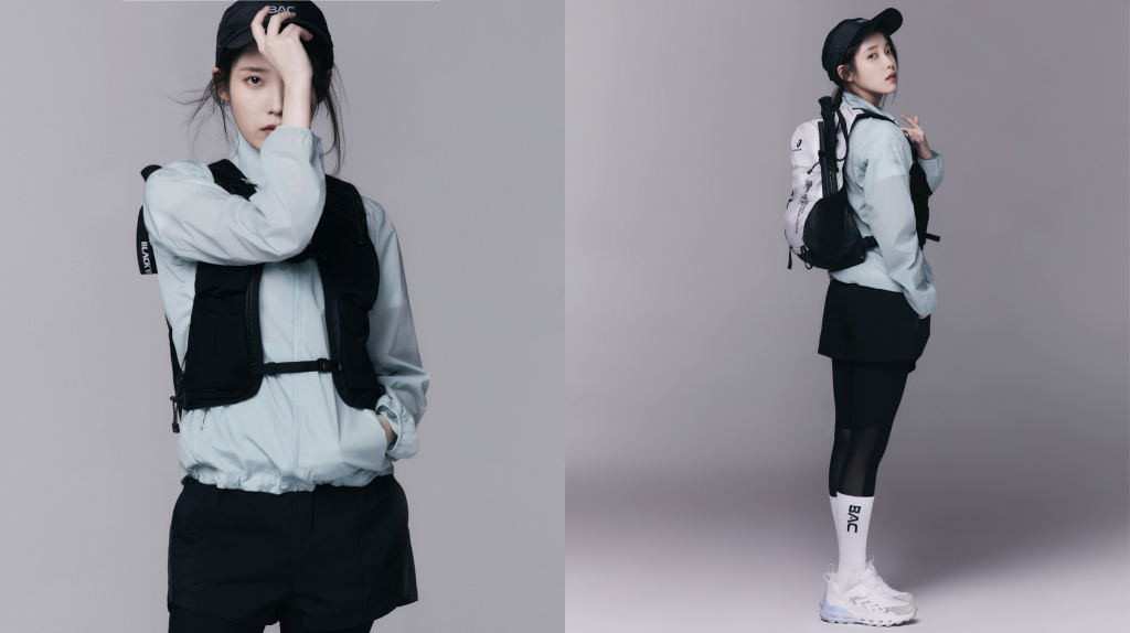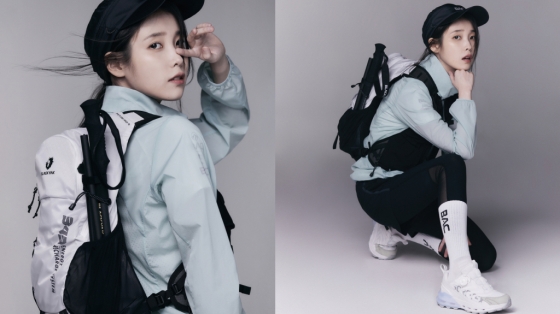 아이유는 '343 시리즈'의 등산화와 조끼형 가방 등을 활용해 변화무쌍한 봄 날씨에도 걱정없이 가벼우면서도 깔끔한 산행 룩을 완벽 소화했다.