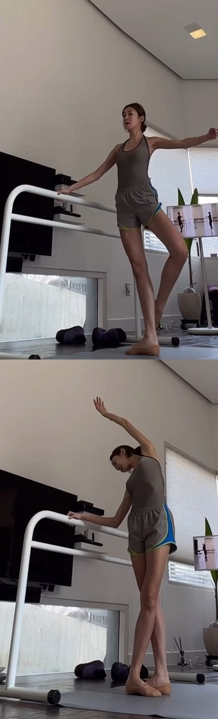 영상 속 윤혜진은 운동복을 입고 발레 동작을 연습하고 있다. 현역 발레리나 같은 유연함과 군살 없는 몸매가 시선을 사로잡는다.