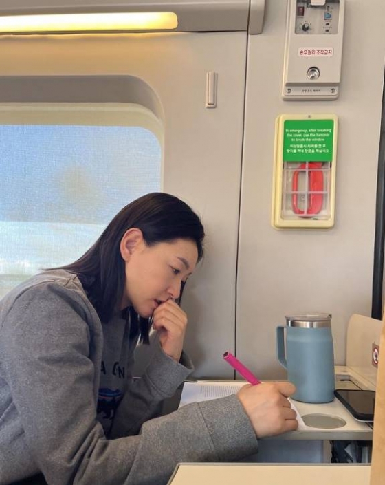 이어 그는 "일회용 마스크가 많이 쓰이고 버려지는 것에 대해 걱정이 많았는데, 마스크를 쓰는 일상으로 다시 돌아가는 일이 없었으면 좋겠어요. #강의원고수정중 #노마스크 #달리는SRT"이라며 사진을 공개했다.