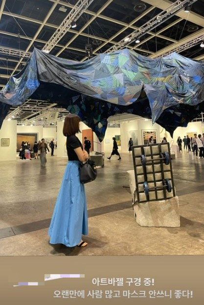 강수정은 사진에서 하늘색 롱 드레스를 입고 아트바젤을 구경하고 있다. 강수정만의 색다른 느낌의 패션 센스가 돋보인다.