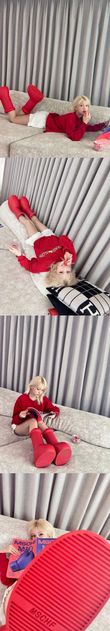 사진 속 전소미는 빨간색 부츠를 신고 소파에 누운 채 여러 가지 포즈를 취하고 있다. 전소미가 신고 있는 부츠는 뉴욕 예술 단체 MSCHF(미스치프)가 얼마 전 선보인 '아톰 부츠'다.