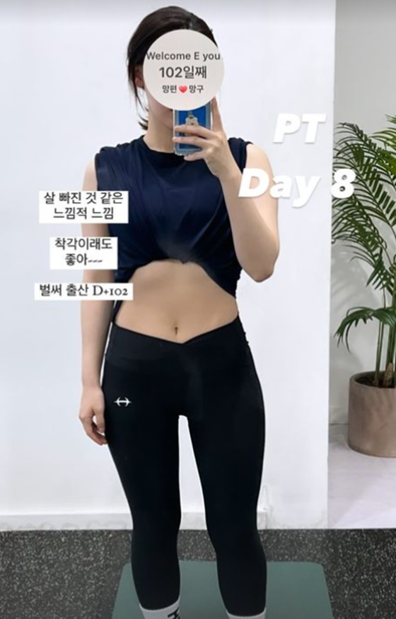 지난 22일 김수민은 "살 빠진 것 같은 느낌적 느낌. 착각이래도 좋아. 벌써 출산 D+102"라는 글과 사진을 게재했다.