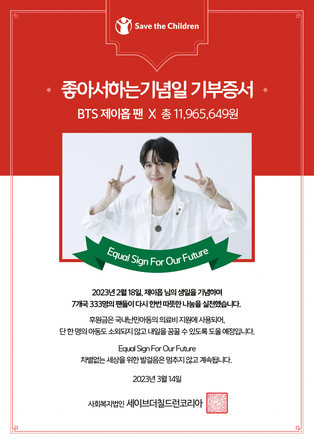 제이홉의 팬 계정 홉온더월드(HopeOnTheWorld)은 3월 14일 사회복지법인 세이브더칠드런에 1196만 5649원을 기부했다.