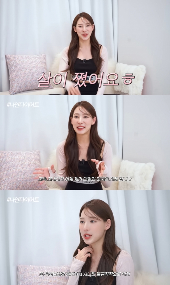 이나연은 "모태 마름을 뚫고 살이 쪘다. 내가 60kg 이상까지 쪘었다. 뱃살도 많고 턱살도 이만했다. 고등학생 때는 몸무게에 관심이 별로 없었다. 몸무게를 안 재서 잘 모르겠는데 58kg 정도였던 거 같다. 대학생 1~2학년 때는 51kg 정도였다. 그땐 정석으로 했다. 또 고3 때 체대 입시를 해서 운동을 8시간 정도 했다"라고 과거를 떠올렸다.