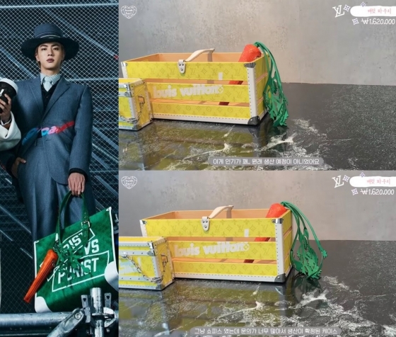 진이 루이비통(LOUIS VUITTON) 패션쇼 영상에서 선보였던 쇼피스인 당근 모양 파우치는 구매를 문의하는 소비자들의 요청이 쏟아진 후, 생산과 판매가 결정되며 큰 화제가 됐다.