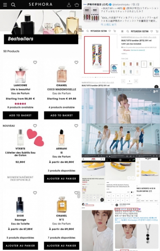 방탄소년단이 브이티 코스메틱(VT COSMETICS)과 컬래버레이션 한 'VT 향수' 중 진의 향수가 유일하게 전 세계에서 가장 유명한 화장품 전문 매장 세포라(Sephora) 온라인 사이트에서 베스트셀러 제품이 되며 시선을 집중시킨 바 있다. 진의 향수가 세포라의 탑 50위 중 15번째로 아르마니와 디오르 제품과 함께 진열된 것.