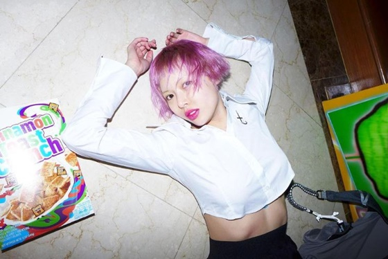 공개된 사진에는 현아가 양팔을 올린 채 바닥에 누운 모습이 담겼다. 현아는 최근까지 유지하던 금발에서 핑크색 헤어로 변신한 모습이다.