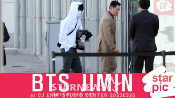 그룹 방탄소년단 지민이 솔로 앨범 'FACE'를 발매하고 26일 오전 경기도 파주시 CJ ENM STUDIO CENTER에서 진행되는 '엠카운트다운' 사전녹화를 위해 도착하고 있다. 2023.03.26