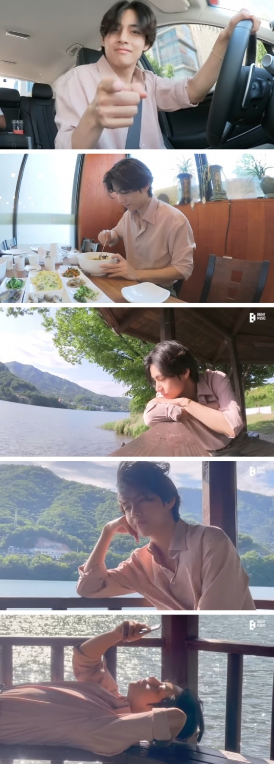 한참을 드라이브한 뷔는 눈에 띄는 식당에 들어가 최애음식인 꼬막비빔밥을 먹었다. 이어 북한강 강변에서 물멍을 즐기고 음악을 듣는 모습은 힐링을 선사했다. 이 영상은 방탄티비 브이로그 최다 조회수 2000만 뷰를 기록하고 있다.