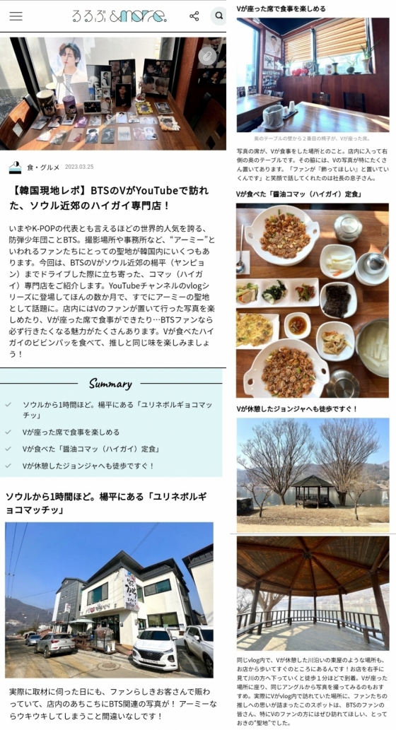 일본의 여행가이드북 루루부(Rurubu)는 뷔가 다녀간 경기도 양평의 맛집과 풍경이 아름다운 북한강가의 정자를 소개했다.