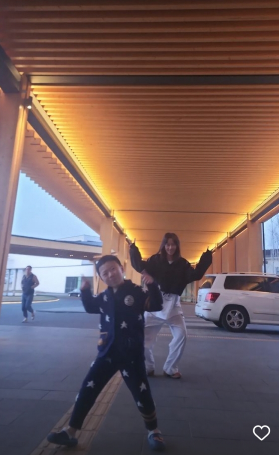 사진에서 황정음은 첫째 아들과 신나는 춤을 추는 듯한 모습이다. 첫째 아들의 뒤에 서서 유쾌한 군무를 소화하는 모습이 웃음을 자아낸다.