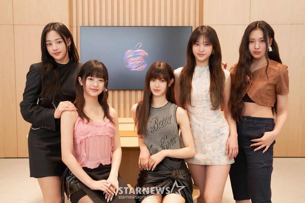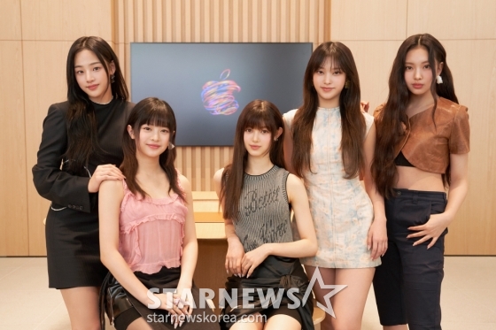걸그룹 뉴진스가 29일 오후 서울 애플(Apple) 강남에서 열린 애플과의 컬래버레이션 프로젝트 기자간담회에서 포즈를 취하고 있다.
