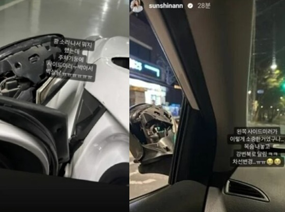 김선신 아나운서는 지난 2일 "쾅 소리 나서 뭐지 했는데 주차 기둥에 사이드 미러 박아서 박살남"이라며 파손된 사이드 미러를 공개했다.