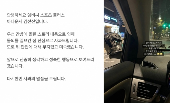 최근 김선신 아나운서는 사이드미러 없이 차량을 운전한 사실이 알려져 논란을 일으켰다. 사실 '셀프 논란'이라고 볼 수 있다. 해당 사실을 자신이 직접 SNS에 올렸기 때문.
