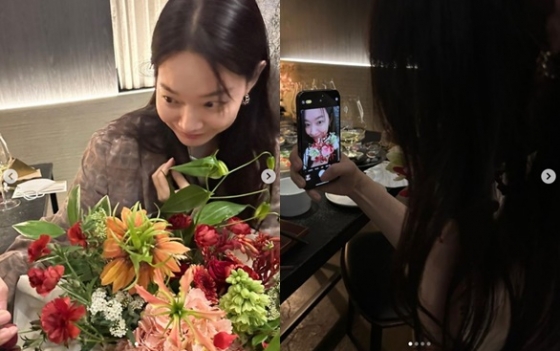 이는 지난 5일 39살 생일을 맞은 신민아가 축하받고 있는 모습. 신민아는 꽃을 안고 셀카를 찍으며 행복한 미소를 짓고 있다.